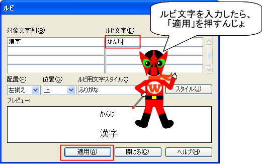 「書式」メニューから「ルビ」を選択すると、ダイアログボックスが表示されます。